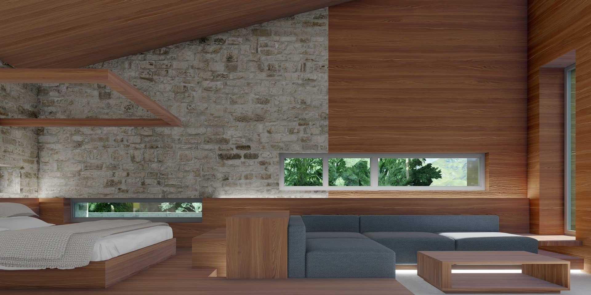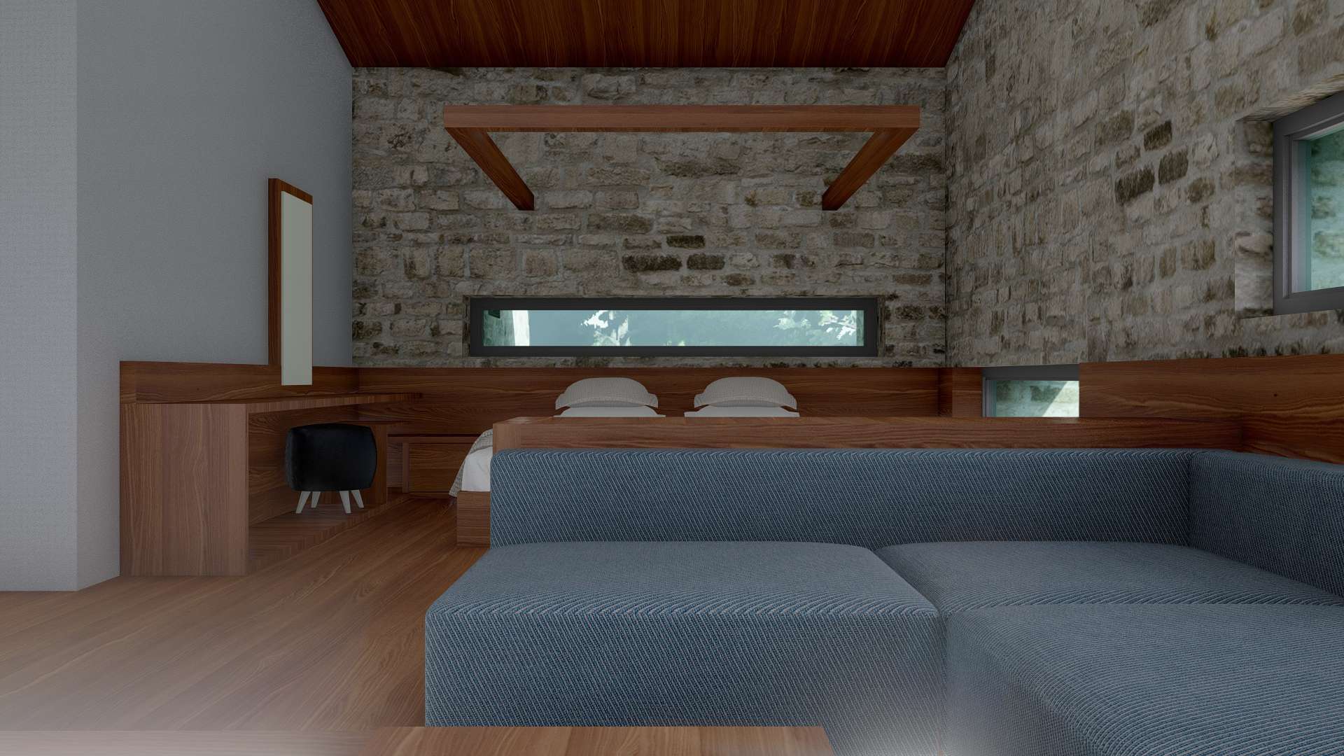 Διατηρώντας τα τοπικά χαρακτηριστικά δόμησης διατηρήθηκε το στοιχείο της πέτρας και προσθέσαμε το στοιχείο του ξύλου εσωτερικά και εξωτερικά. Οι κατοικίες είναι ενός ενιαίου χώρου, τυπου studio δημιουργώντας ένα αποτέλεσμα όπου δεν αλλοιώνεται ο τοπικός χαρακτήρας αλλά συνυπάρχει αρμονικά με σύγχρονα στοιχεία και σχεδιασμό.