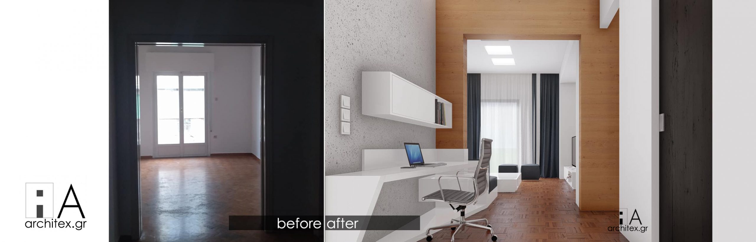 Πλήρης μελέτη ανακαίνισης διαμερίσματος 4 ορόφου, κατασκευής δεκαετίας ΄70 .Το γραφείο μας κλήθηκε να μεταμορφώσει ένα διαμέρισμα με άβολη διαρρύθμιση σε ένα σύγχρονο και λειτουργικό σπίτι.